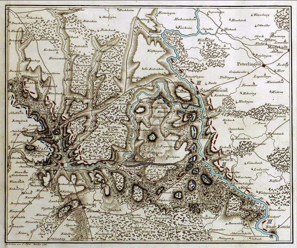 Stellungen der Franzosen und der Deutschen am Oberrhein, 1793 nach Süden ausgerichtete Karte mit dem linksrheinischen Gebiet zwischen Pirmasens, Landau und Straßburg mit den Befestigungen und Stellungen bei Germersheim, Pirmasens, Weissenburg, Hagenau
